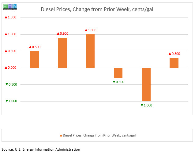 In the East Coast PADD 1, diesel prices rose 0.9 cents to reach an average price of $2.524/gallon. Within PADD 1, New England prices increased by 1.7 cents to average $2.648/gallon. Central Atlantic diesel prices rose by 1.0 cent to average $2.704/gallon. Lower Atlantic prices rose by 0.7 cents to reach an average price of $2.377/gallon. PADD 1 prices were 55.6 cents/gallon below their levels for the same week last year.
