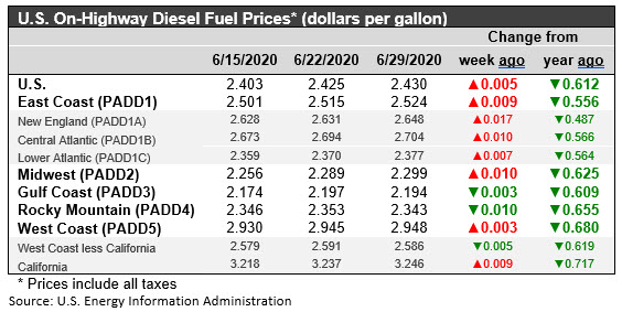 The week ended June 29 brought a 0.5 cents/gallon increase in the retail price for diesel. For the year to date, diesel prices have fallen by a cumulative 64.9 cents/gallon, a major downward slump that is reversing gradually. In the autumn of 2019, retail diesel prices had been below the $3/gallon mark until the attacks on Saudi Arabian oil facilities in mid-September 2019. They rose at that time, and they remained above the $3/gallon mark until the week ended February 3, 2020. Prices then continued to slide. For the current week, retail diesel prices rose by 0.5 cents to arrive at an average price of $2.430/gallon. Prices rose in PADDs 1, 2 and 5, while declining in PADDs 3 and 4. The national average price for the week was 61.2 cents/gallon below where it was during the same week last year.