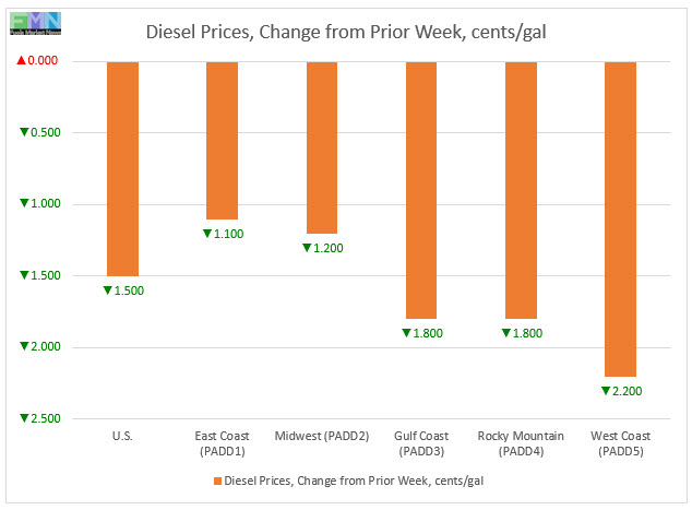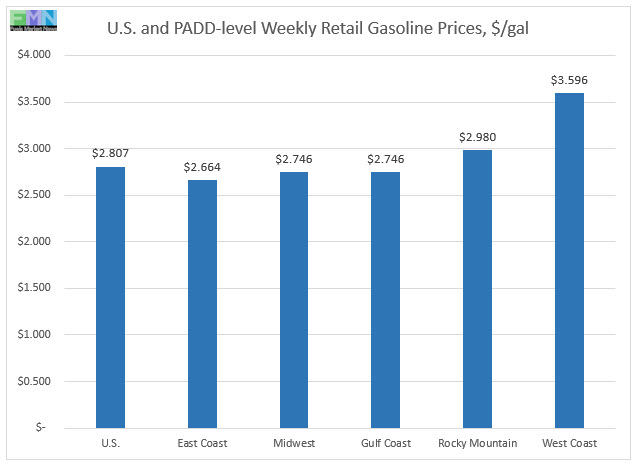 In the Gulf Coast PADD 3, retail diesel prices fell by 1.8 cents to average $2.875/gallon. PADD 3 typically has the lowest diesel prices, and it remains the only PADD where retail diesel prices are below the $3/gallon mark. Prices were 18.0 cents lower than for the same week in the previous year.