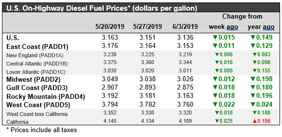 The U.S. Energy Information Administration (EIA) released its weekly data on diesel and gasoline retail prices for the week ended June 3, 2019. Gasoline prices fell for the fourth week in a row. Diesel prices also declined. On a national average basis, retail prices for both gasoline and diesel fell by 1.5 cents/gallon. National average prices for gasoline were 13.3 cents/gallon below where they were in the same week one year ago. National average prices for diesel were 14.9 cents/gallon lower than they were in the same week last year.