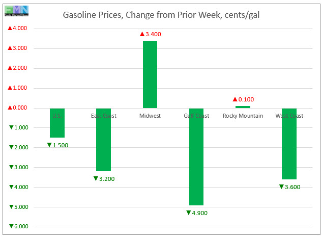 In the Gulf Coast PADD 3 market, gasoline prices dropped by 4.9 cents to average $2.473/gallon. This was the largest price drop among the PADDs. PADD 3 continues to have the lowest average prices among the PADDs. Prices for the week were 30.1 cents lower than for the same week last year.