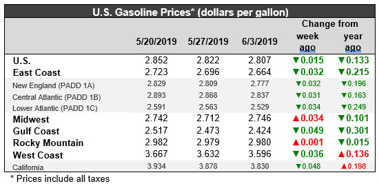 U.S. retail gasoline prices fell by 1.5 cents to average $2.807/gallon during the week ended June 3rd. Prices fell in PADDs 1, 3, and 5, while they rose in PADDs 2 and 4. Retail prices for the current week were 13.3 cents per gallon lower than they were one year ago. Gasoline prices hit a peak of $2.903/gallon during the week ended October 8, 2018. Prices then slid downward for 14 weeks in a row, shedding a total of 66.6 cents per gallon. In the next 17 weeks, prices marched back up by 66.0 cents/gallon. Prices came very close to the peak they hit in early October, before the month of May brought an easing of prices. Flooding is disrupting corn planting and ethanol production and distribution, which is contributing to significant variations in regional gasoline prices.