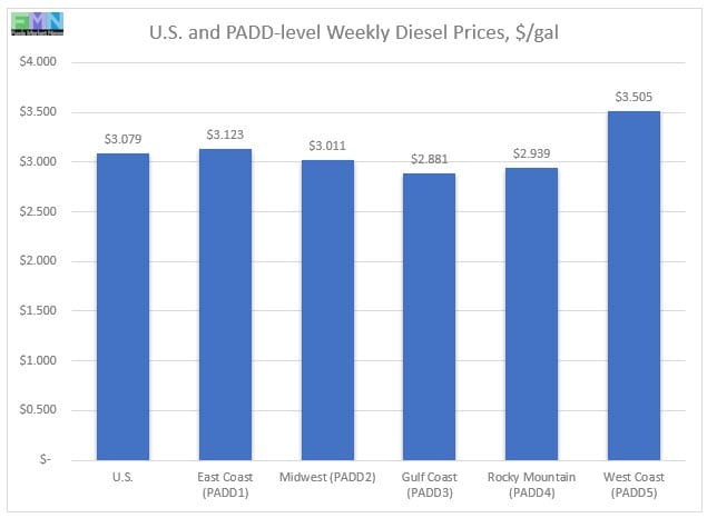 In the East Coast PADD 1, diesel prices rose by 0.4 cents/gallon to reach an average price of $3.123/gallon. Within PADD 1, New England prices rose by 0.6 cents to average $3.183/gallon. Central Atlantic diesel prices increased by 1.4 cents to average $3.315/gallon. Lower Atlantic prices fell by 0.4 cents to arrive at an average price of $2.981/gallon. PADD 1 prices were 9.9 cents/gallon above their prices for the same week last year.