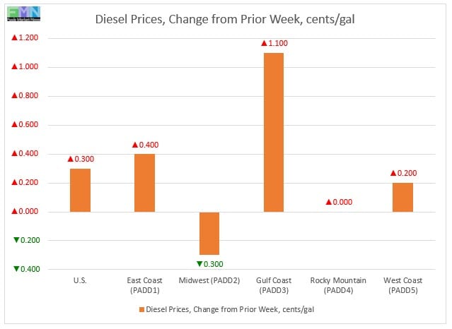In the Midwest PADD 2 market, retail diesel prices declined modestly by 0.3 cents to average $3.011/gallon. This was the only PADD where prices fell. Prices were 11.2 cents/gallon above their level for the same week last year.