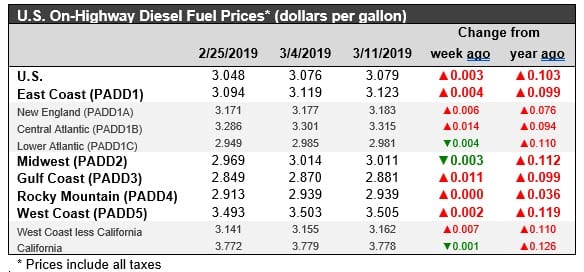 The U.S. Energy Information Administration (EIA) released its weekly data on diesel and gasoline retail prices for the week ended March 11, 2019. Prices for both fuels rose in all PADDs countrywide for the third week in a row. On a national average basis, retail prices for gasoline rose by 4.9 cents/gallon. Diesel prices edged up only slightly by 0.3 cents/gallon. In early February, retail prices began to stabilize, pulling out of the downward slide seen since prices peaked in October 2018. National average prices for gasoline remain below their levels from one year ago. However, diesel prices are higher than they were at the same time last year, and prices have risen above the $3/gallon level again.