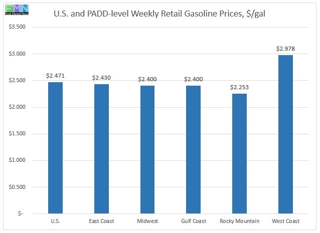 In the Midwest PADD 2 market, retail gasoline prices jumped by 7.1 cents to reach an average price of $2.40/gallon. This was the largest price increase among the PADDs. PADD 2 prices for the current week were 3.9 cents/gallon lower than they were for the same week last year.