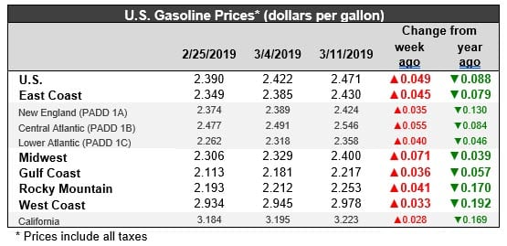 U.S. retail gasoline prices rose by 4.9 cents to average $2.471/gallon during the week ended March 11. Prices rose in all PADDs. The national average price was 8.8 cents per gallon lower than it was one year ago. Gasoline prices are 43.2 cents/gallon below the peak price hit in early October.