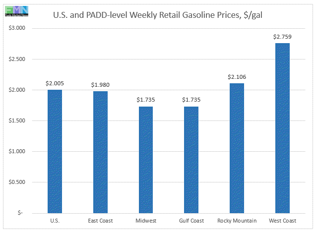 In the Rocky Mountains PADD 4 market, gasoline pump prices dropped by 13.1 cents to settle at an average price of $2.106/gallon. This week’s PADD 4 prices were 36.3 cents lower than at the same time last year.