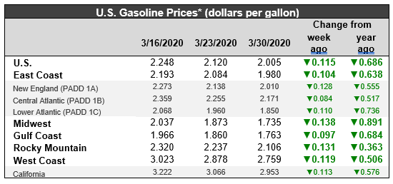 The U.S. Energy Information Administration (EIA) released its weekly data on diesel and gasoline retail prices for the week ended March 30, 2020. Gasoline and diesel prices both fell once again, again by a significant level. Diesel prices fell by 7.3 cents/gallon. Gasoline prices dropped by 11.5 cents/gallon. The national average price for gasoline was $2.005/gallon, which was a massive 68.6 cents/gallon below the price for the same week one year ago. Prices in three of five PADDs have fallen below the $2/gallon level, and it seems only a matter of days before the national average does as well. From late-November through early March, gasoline prices had been above their levels from last year. Prices declined until, during the week ended March 2, retail gasoline prices were a mere 0.001 cent/gallon above last year’s level. The dramatic price declines since then have brought gasoline prices significantly below their levels of last year.