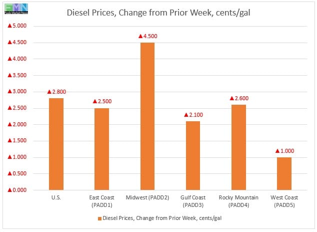In the Midwest PADD 2 market, retail diesel prices rose by 4.5 cents to average $3.014/gallon. This was the largest price increase among the PADDs. Prices were 9.4 cents/gallon above their level for the same week last year.
