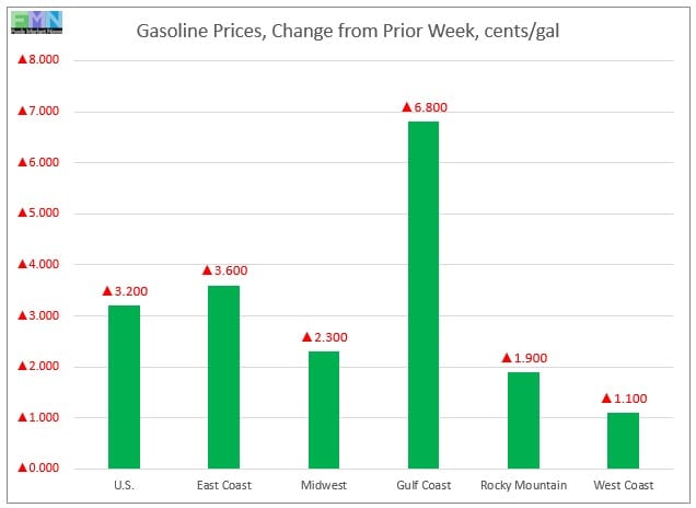 In the Midwest PADD 2 market, retail gasoline prices rose by 2.3 cents to reach an average price of $2.329/gallon. PADD 2 prices for the current week were 9.9 cents/gallon lower than they were for the same week last year.