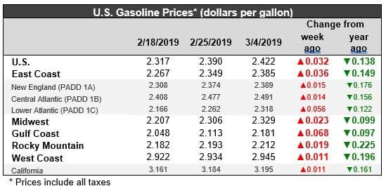 U.S. retail gasoline prices rose by 3.2 cents to average $2.422/gallon during the week ended March 4. Prices rose in all PADDs. The national average price was 13.8 cents per gallon lower than it was one year ago. Gasoline retail prices have been creeping back up, but overall, prices remain low, and they are below their levels of last year. Gasoline prices are 48.1 cents/gallon below the peak price hit in early October.