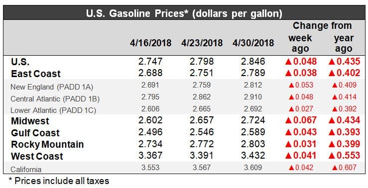 U.S. retail gasoline prices increased by 4.8 cents during the week ended April 30, to arrive at an average price of $2.846/gallon. Gasoline prices rose in all PADDs countrywide.