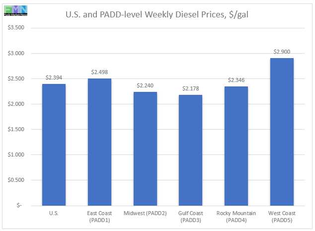 In the Gulf Coast PADD 3, retail diesel prices rose by 0.9 cents to arrive at an average of $2.178/gallon. PADD 3 continues to have the lowest diesel prices among the PADDs, currently 21.6 cents below the U.S. average. Prices were 72.7 cents below their level for the same week in the previous year.
