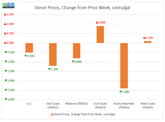 In the Rocky Mountains PADD 4 market, retail diesel prices dropped by 2.4 cents to settle at an average of $2.346/gallon. This was the largest price drop among the PADDs. PADD 4 prices were 83.5 cents lower than for the same week in the prior year.