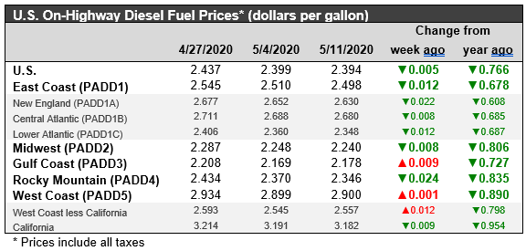 Retail prices for diesel have now fallen for 18 consecutive weeks—every week this calendar year since the first week of January. Prices have fallen by a cumulative 68.5 cents/gallon. Last autumn, retail diesel prices had been below the $3/gallon mark until the attacks on Saudi Arabian oil facilities in mid-September 2019. They rose at that time, and they remained above the $3/gallon mark until the week ended Feb. 3, 2020. Prices have continued to slide. For the current week ended May 11, retail diesel prices declined by 3.8 cents to settle at an average price of $2.399/gallon. For the current week ended May 11, diesel prices fell in PADDs 1, 2 and 4, while rising in PADDs 3 and 5. The national average price for the week was 76.6 cents/gallon below where it was during the same week last year. According to EIA data, diesel demand has dropped by 212% in the seven-week period from March 13 through May 1.
