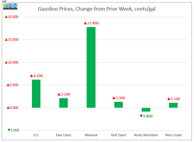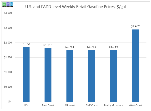 In the Midwest PADD 2 market, retail gasoline prices jumped by 17.8 cents to average $1.751/gallon. The past two weeks have brought PADD 2 prices back above prices in the U.S. Gulf Coast PADD 3 market. PADD 2 prices for the week were $0.987/gallon lower than they were for the same week last year.
