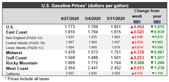 For the week ended May 11, retail prices for gasoline jumped by 6.2 cents/gallon. Retail prices for diesel continued a gentle decline of 0.5 cents/gallon. The national average price for gasoline was $1.851/gallon. This price was $1.015/gallon below the price for the same week one year ago. In February, just two months ago, retail prices for gasoline were higher than they had been a year earlier. Now, prices in four of the five PADDs are below the $2/gallon level, with only the West Coast PADD 5 having retail prices above $2/gallon. From late-November through early March, gasoline prices had been above their levels from last year. Prices declined until, during the week ended March 2, retail gasoline prices were a mere 0.001 cent/gallon above last year’s level. The dramatic price declines since then have brought gasoline prices significantly below their levels of last year.
