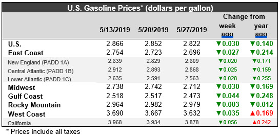U.S. retail gasoline prices fell by 3.0 cents to average $2.822/gallon during the week ended May 27. Prices fell in all PADDs. Retail prices for the current week were 14.0 cents per gallon lower than they were one year ago. Gasoline prices hit a peak of $2.903/gallon during the week ended October 8, 2018. Prices then slid downward for 14 weeks in a row, shedding a total of 66.6 cents per gallon. In the next 17 weeks, prices marched back up by 66.0 cents/gallon. Prices came very close to the peak they hit in early October, before the month of May brought an easing of prices.