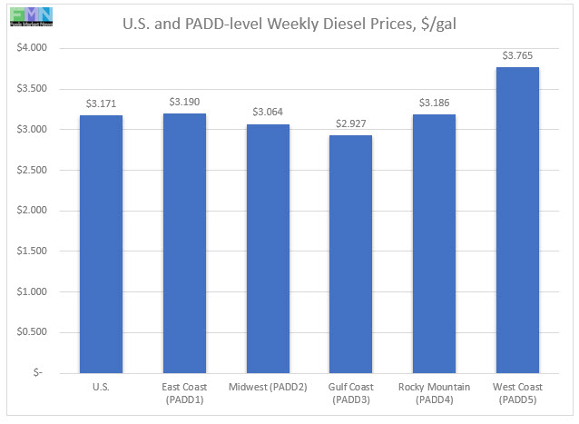 In the Gulf Coast PADD 3, retail diesel prices fell by 1.2 cents to average $2.927/gallon. PADD 3 typically has the lowest diesel prices, and it is the only PADD where retail diesel prices are still below the $3/gallon mark. Prices were 2.8 cents lower than for the same week in the previous year.