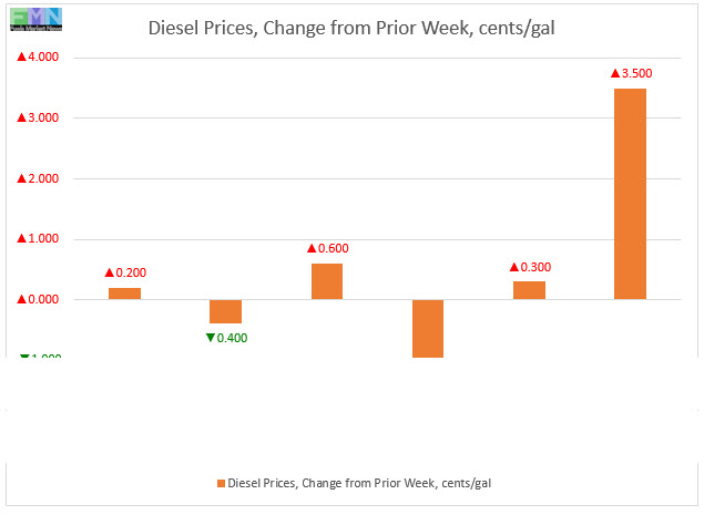 In the West Coast PADD 5 market, retail diesel prices rose by 3.5 cents to average $3.765/gallon. This was the largest price increase among the PADDs. PADD 5 prices were 10.3 cents above their level from last year. Prices excluding California eased slightly by 0.1 cents to arrive at an average of $3.345/gallon. This price was 6.4 cents below the retail price for the same week last year. California diesel prices rose by 6.2 cents to arrive at an average price of $4.097/gallon. California is the only market for which prices have risen above $4/gallon, and prices have been above $4/gallon for the past three weeks. California diesel prices are 23.4 cents higher than they were at the same week last year.