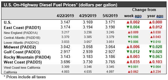 During the week ended May 5, 2019, West Texas Intermediate (WTI) crude futures prices fell by $1.01/b (1.6%.) Gasoline futures prices decreased by 7.0 cents/gallon (3.4%.) Diesel futures prices rose by 2.7 cents/gallon (1.3%.) Although the relationship between futures market prices and retail prices is not immediate and one-for-one, the most recent trend in futures prices suggests that gasoline and diesel retail prices will ease moderately in the coming week.