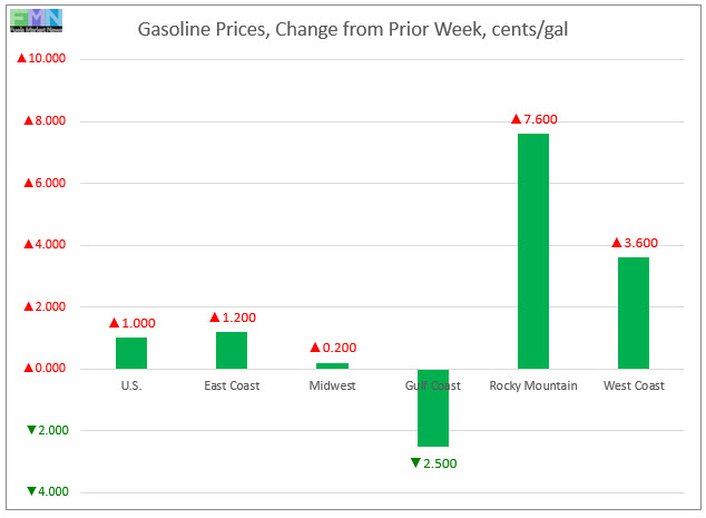In the Rocky Mountains PADD 4 market, gasoline pump prices jumped by 7.6 cents to arrive at an average price of $2.919/gallon. This was the largest price increase among the PADDs. Prices have been rising rapidly in PADD 4, and last week brought them above last year’s levels. This week’s prices were 9.8 cents higher than at the same time last year.