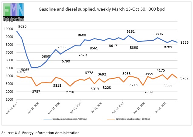 The EIA publishes weekly “product supplied” data as its proxy for demand. These data show gasoline demand crashing from 9,696 barrels per day (kbpd) during the week ended March 13 to just 5,065 kbpd during the week ended April 3, a huge hit of 4,631 kbpd in just four weeks. That was the low point. Demand thereafter trended generally up until it reached 8,608 kbpd during the week ended June 19. Since then, demand has cycled up and down, but it has never regained its March 13 level. Apparent demand recovered to 8,809 kbpd during the week ended July 24, retreated to 8,617 kbpd during the week ended July 31, then jumped to 9,161 kbpd during the week ended August 21. Since then, demand has been in the range of 8,400-8,900 kbpd. It rose to 8,896 kbpd during the week ended October 2, then fell again over the ensuing two weeks. Gasoline product supplied averaged 8,336 kbpd during the most recent week ended October 30. The EIA points out that “product supplied” is not a precise measure of demand, but these data provide the most up-to-date numbers publicly available.