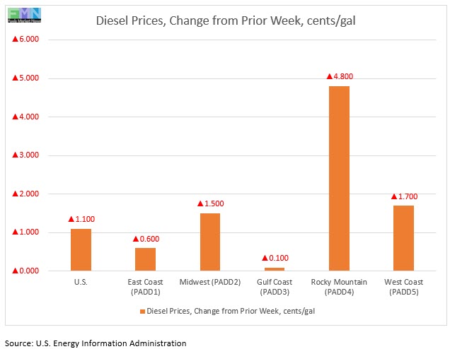 In the Rocky Mountains PADD 4 market, retail diesel prices rose significantly by 4.8 cents to average $2.372/gallon. This was the largest price increase among the PADDs. PADD 4 prices were 83.1 cents lower than for the same week in the prior year.