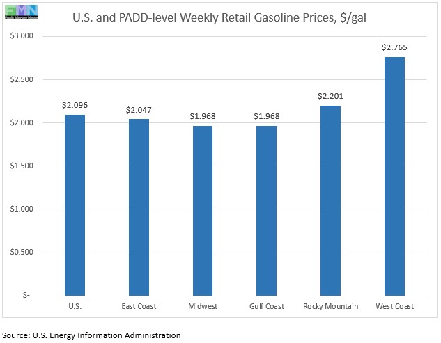 In the Midwest PADD 2 market, retail gasoline prices eased slightly by 0.1 cent to average $1.968/gallon. PADD 2 last week joined PADD 3 in having gasoline prices fall below $2 a gallon. PADD 2 prices for the week were 46.8 cents/gallon lower than they were for the same week last year.