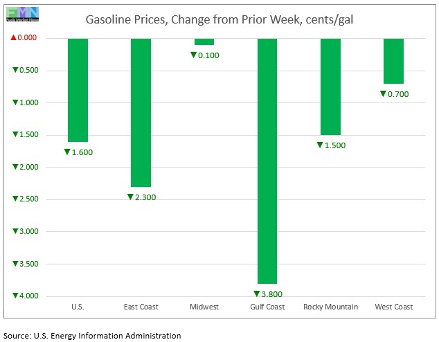 Diesel prices also had been above last year’s level, but prices are now well below these levels. On a national basis, the retail price for diesel averaged $2.383/gallon—69.0 cents/gallon lower than the price in the same week last year.