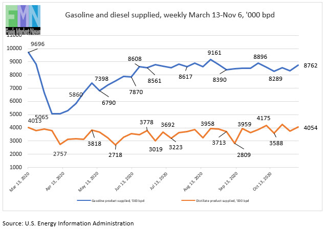 The EIA publishes weekly “product supplied” data as its proxy for demand. These data show gasoline demand crashing from 9,696 barrels per day (kbpd) during the week ended March 13 to just 5,065 kbpd during the week ended April 3, a huge hit of 4,631 kbpd in just four weeks. That was the low point. Demand thereafter trended generally up until it reached 8,608 kbpd during the week ended June 19. Since then, demand has cycled up and down, but it has never regained its March 13 level. Apparent demand recovered to 8,809 kbpd during the week ended July 24, retreated to 8,617 kbpd during the week ended July 31, then jumped to 9,161 kbpd during the week ended August 21. Since then, demand has been in the range of 8,400-8,900 kbpd. It rose to 8,896 kbpd during the week ended October 2, then fell again over the ensuing two weeks. Gasoline product supplied averaged 8,762 kbpd during the most recent week ended November 6. The EIA points out that “product supplied” is not a precise measure of demand, but these data provide the most up-to-date numbers publicly available.