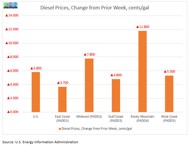In the Rocky Mountains PADD 4 market, retail diesel prices spiked by 11.8 cents to average $2.490 gallon. This was the largest price increase among the PADDs. PADD 4 prices were 74.2 cents lower than for the same week in the prior year.