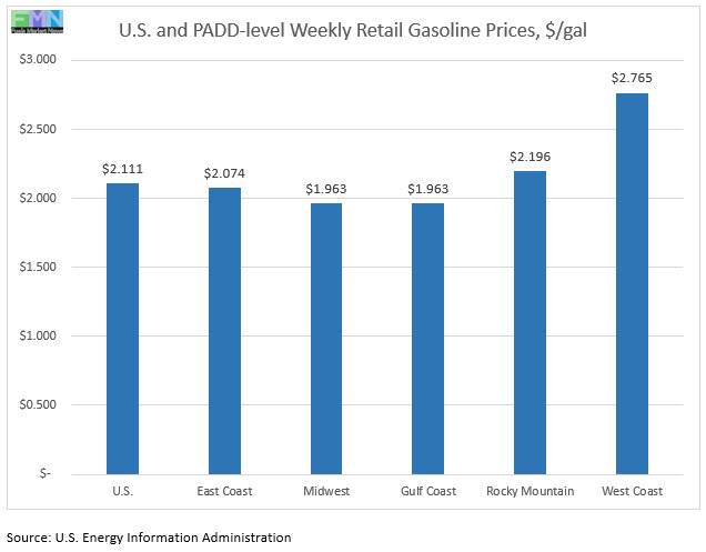 In the Midwest PADD 2 market, retail gasoline prices eased by 0.5 cents to average $1.963/gallon. Three weeks ago, PADD 2 joined PADD 3 in having gasoline prices fall below $2 a gallon. PADD 2 prices for the week were 47.2 cents/gallon lower than they were for the same week last year.