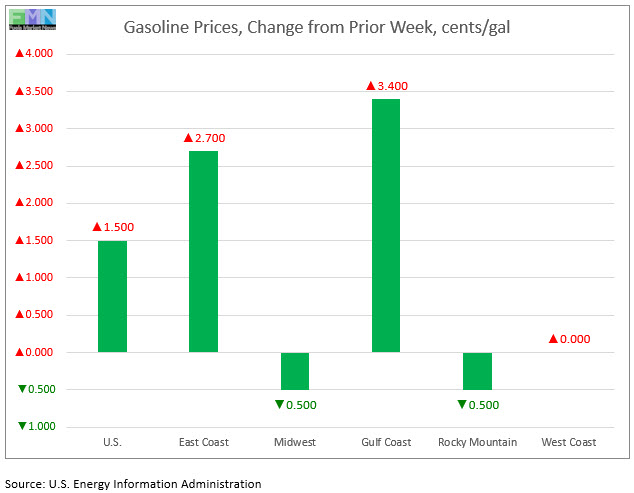 For the week ended November 16, retail prices for gasoline rose by 1.5 cents/gallon. Retail prices for diesel rose by 5.8 cents/gallon.