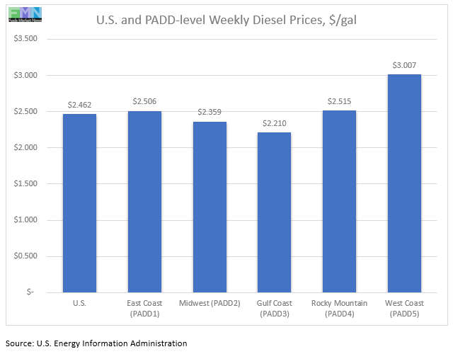 Diesel prices also had been above last year’s level, but prices are now well below these levels. On a national basis, the retail price for diesel averaged $2.462/gallon—60.4 cents/gallon lower than the price in the same week last year.