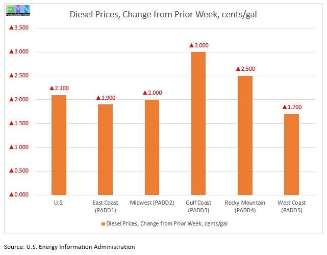 In the Gulf Coast PADD 3, retail diesel prices rose by 3.0 cents to average $2.21/gallon. PADD 3 continues to have the lowest diesel prices among the PADDs, currently 25.2 cents below the U.S. average. Prices were 56.6 cents below their level for the same week in the previous year.