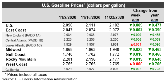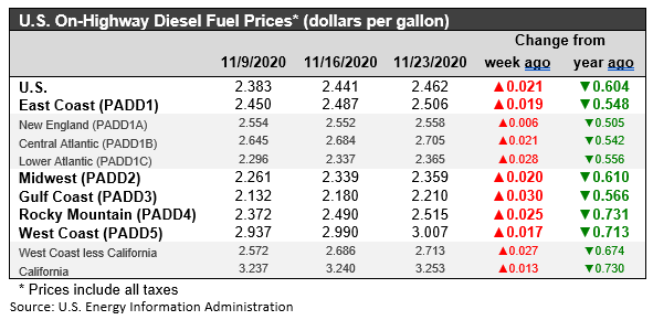 The U.S. Energy Information Administration (EIA) released its weekly data on diesel and gasoline retail prices for the week ended November 23. Gasoline prices fell by 0.9 cents per gallon, while diesel prices rose by 2.1 cents per gallon. Retail prices for gasoline averaged $2.102/gallon. Diesel prices averaged $2.462/gallon. The COVID-19 pandemic caused severe demand destruction. Demand has been recovering gradually, but it has not steadily regained pre-pandemic levels, nor is it expected to this calendar year. COVID-19 infections are surging, with daily infections continuing to break past records.