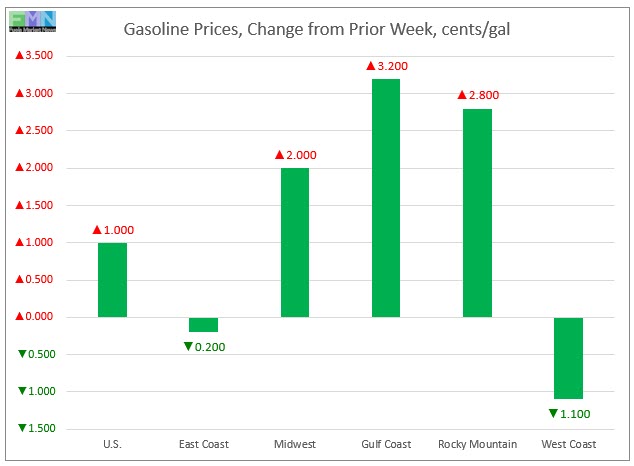 In the Gulf Coast PADD 3 market, gasoline prices rose by 3.2 cents to average $2.230/gallon. This was the largest price increase among the PADDs. PADD 3 continues to have the lowest average prices among the PADDs, currently 35.3 cents/gallon below the average U.S. price. Prices for the week were 12.5 cents lower than for the same week last year.