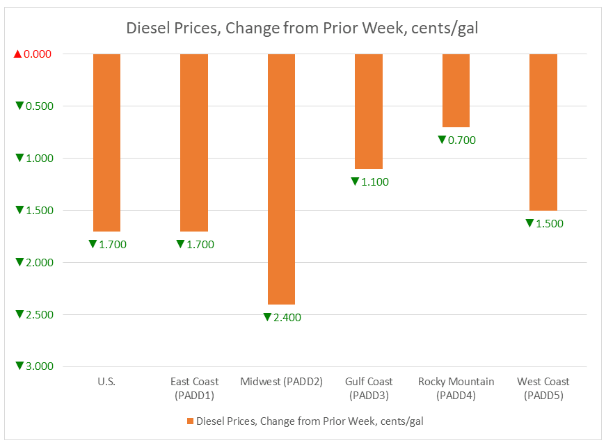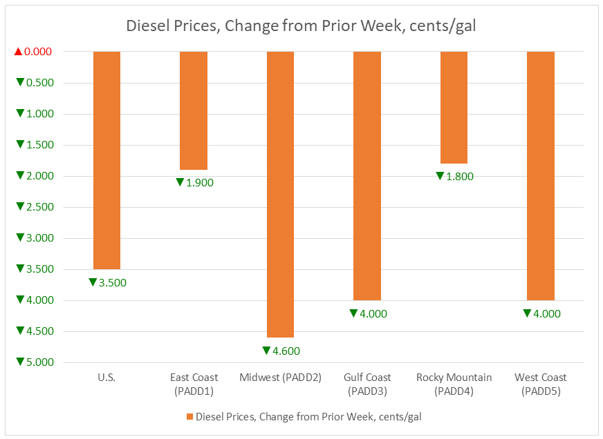 In the Midwest PADD 2 market, retail diesel prices fell by 4.6 cents to average $3.216/gallon. This was the largest price decrease among the five PADDs. Prices were 34.3 cents/gallon above their level for the same week last year.