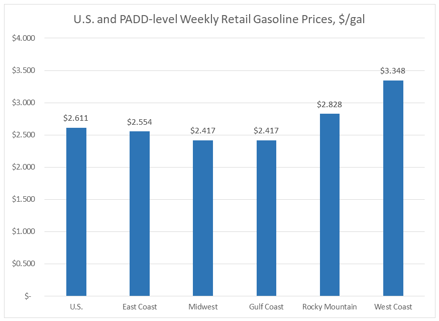 In the Gulf Coast PADD 3 market, gasoline prices dropped by 7.9 cents to average $2.308/gallon. PADD 3 continues to have the lowest average prices among the PADDs. Prices for the week were 2.3 cents higher than for the same week in 2017.
