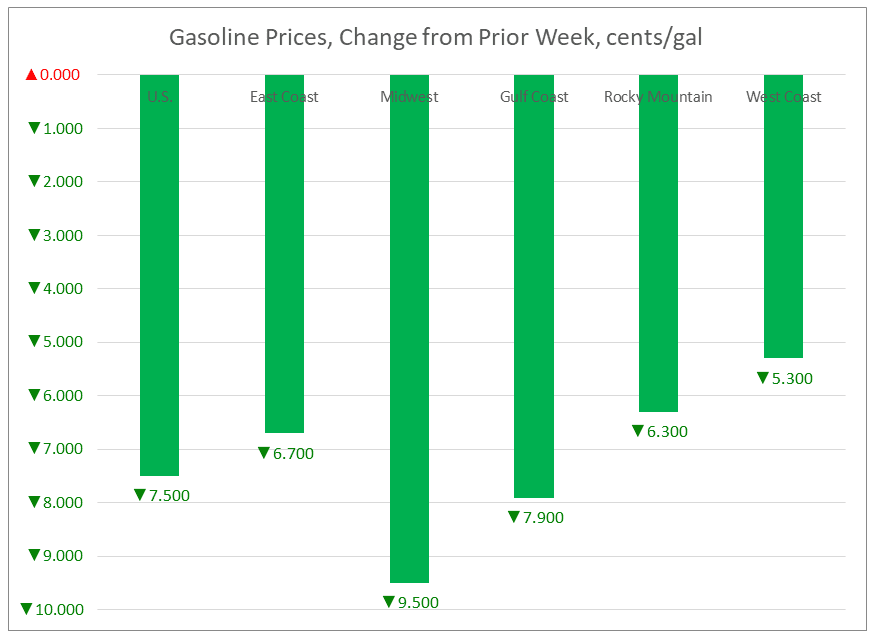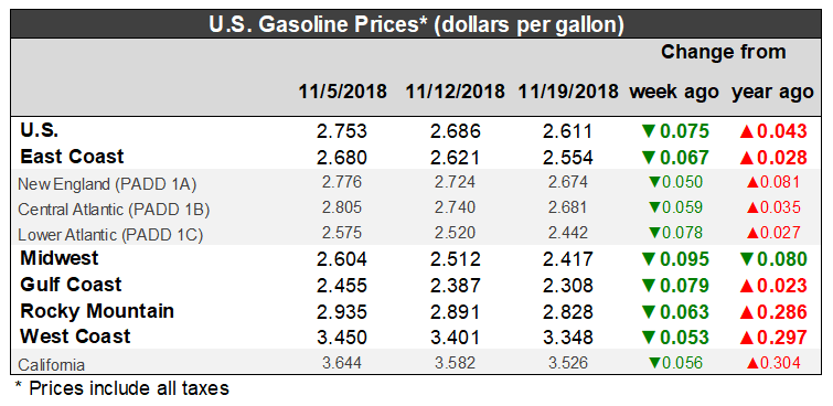 U.S. retail gasoline prices dropped significantly by 7.5 cents to average $2.611/gallon during the week ended November 19. Prices fell in all PADDs. The national average price was 4.3 cents per gallon higher than it was one year ago. Retail prices for gasoline have fallen for the past six weeks, amounting to a major price drop of 29.2 cents/gallon.
