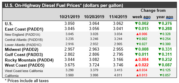 For the current week ended November 4, retail diesel prices eased slightly by 0.2 cents to arrive at an average price of $3.062/gallon. Retail diesel prices had been below the $3/gallon mark until the attacks on Saudi Arabia. Between mid-October and late-January, retail diesel prices fell for fourteen consecutive weeks. During those fourteen weeks, the price decline totaled 42.9 cents/gallon. From February through April, diesel prices crept back up by 20.4 cents/gallon. The month of May brought a modest reversal in the upward trend in diesel prices. During the five weeks of June including the week ended July 1st, diesel prices fell more substantially, declining by 10.9 cents/gallon. For the current week ended November 4th, diesel prices fell in PADDs 1, 2 and 3, while rising in PADDs 4 and 5. The national average price for the week was 27.6 cents/gallon below where it was during the same week last year.