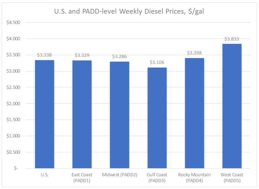 In the Rocky Mountains PADD 4 market, retail diesel prices decreased by 0.7 cents to average $3.398/gallon. PADD 4 prices were 43.3 cents higher than in the prior year.