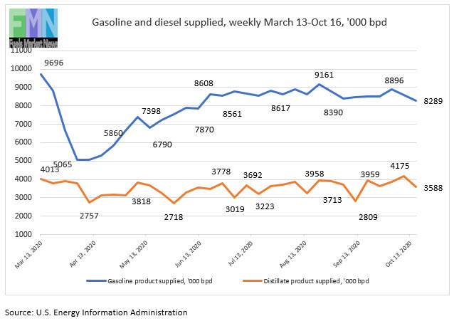 The EIA publishes weekly “product supplied” data as its proxy for demand. These data show gasoline demand crashing from 9,696 barrels per day (kbpd) during the week ended March 13 to just 5,065 kbpd during the week ended April 3, a huge hit of 4,631 kbpd in just four weeks. That was the low point. Demand thereafter trended generally up until it reached 8,608 kbpd during the week ended June 19. Since then, demand has cycled up and down, but it has never regained its March 13 level. Apparent demand recovered to 8,809 kbpd during the week ended July 24, retreated to 8,617 kbpd during the week ended July 31, then jumped to 9,161 kbpd during the week ended August 21. Since then, demand has been in the range of 8,400-8,900 kbpd. It rose to 8,896 kbpd during the week ended October 2, then fell again over the ensuing two weeks to settle at 8,289 kbpd during the most recent week ended October 16. The EIA points out that “product supplied” is not a precise measure of demand, but these data provide the most up-to-date numbers publicly available.