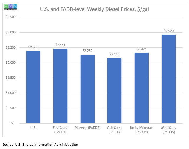 In the Gulf Coast PADD 3, retail diesel prices rose by 0.3 cents to average $2.146/gallon. This was the only price increase among the PADDs. PADD 3 continues to have the lowest diesel prices among the PADDs, currently 23.9 cents below the U.S. average. Prices were 66.0 cents below their level for the same week in the previous year.