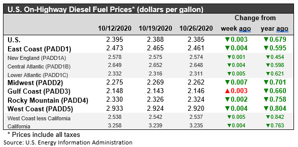 The week ended October 26 brought a 0.3 cents per gallon decrease in the retail price for diesel to reach an average price of $2.385/gallon. Prices declined in all PADDs except for PADD 3. The national average price for the week was 67.9 cents/gallon below where it was during the same week last year.