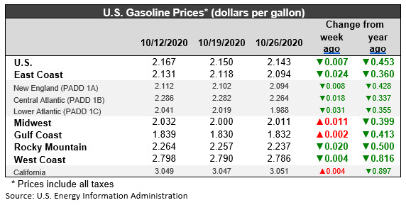 For the current week ended October 26, East Coast PADD 1 gasoline retail prices declined by 2.4 cents to average $2.094/gallon. This week’s average price was 36.0 cents/gallon below where it was during the same week last year. Within PADD 1, New England prices fell by 0.8 cents to average $2.094/gallon. Central Atlantic market prices fell by 1.8 cents to average $2.264/gallon. Prices in the Lower Atlantic market dropped by 3.1 cents to average $1.988/gallon.