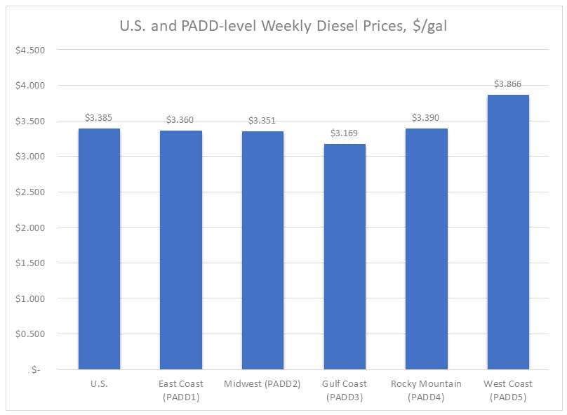 In the Rocky Mountains PADD 4 market, retail diesel prices increased by 2.3 cents to average $3.390/gallon. PADD 4 prices were 53.4 cents higher than in the prior year.