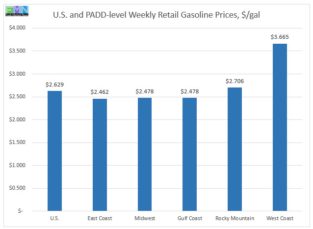 In the Midwest PADD 2 market, retail gasoline prices fell by 2.1 cents to average $2.478/gallon. PADD 2 prices have been volatile in recent weeks. PADD 2 prices for the current week were 28.0 cents/gallon lower than they were for the same week last year.